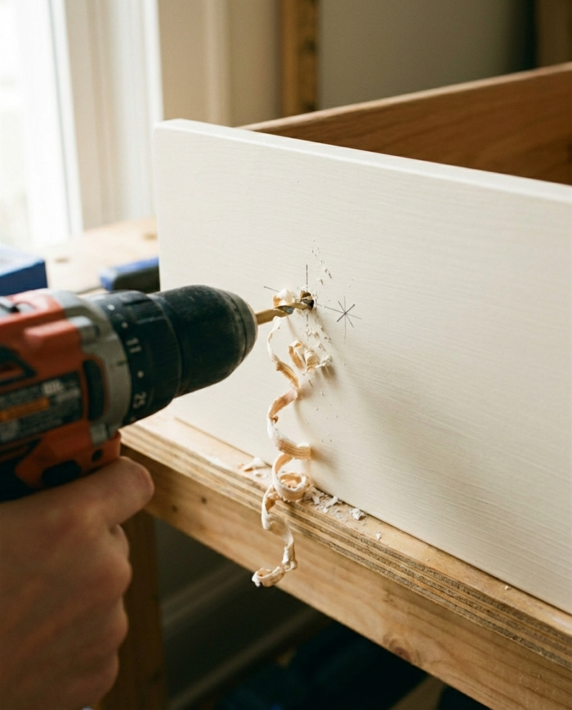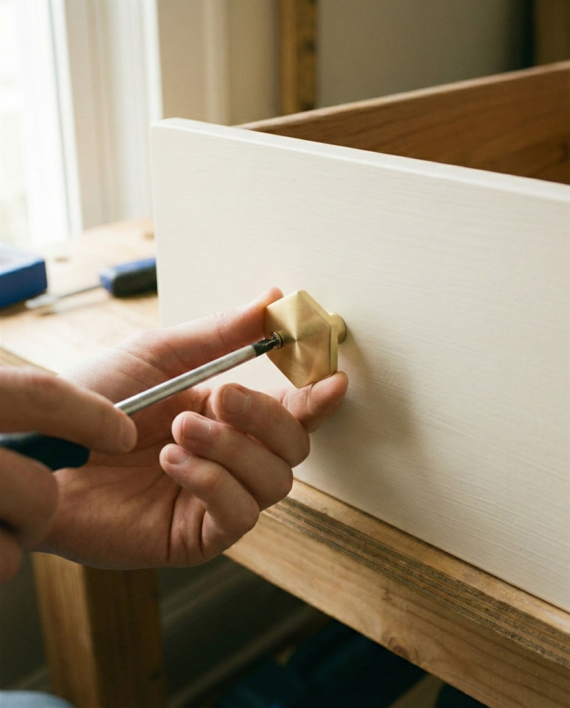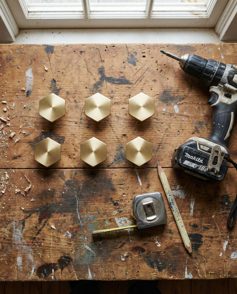 12. New Hardware. The old hardware holes rarely match the new stuff you bought. You should have filled the old ones back on Day 1. Measure ten times, drill once. I bought modern gold hex pulls that instantly made the piece look ten times more expensive.