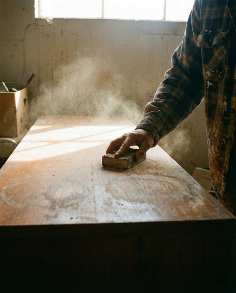 3. The scratching. You don’t need to sand all the old finish off unless it’s peeling badly. You just need to scuff up the shiny surface so the new paint has something to grip onto. It’s called mechanical adhesion. Use 150-grit paper. Sand in the direction of the wood grain. It’s dusty, miserable work. Your arm will hurt. Do it anyway.