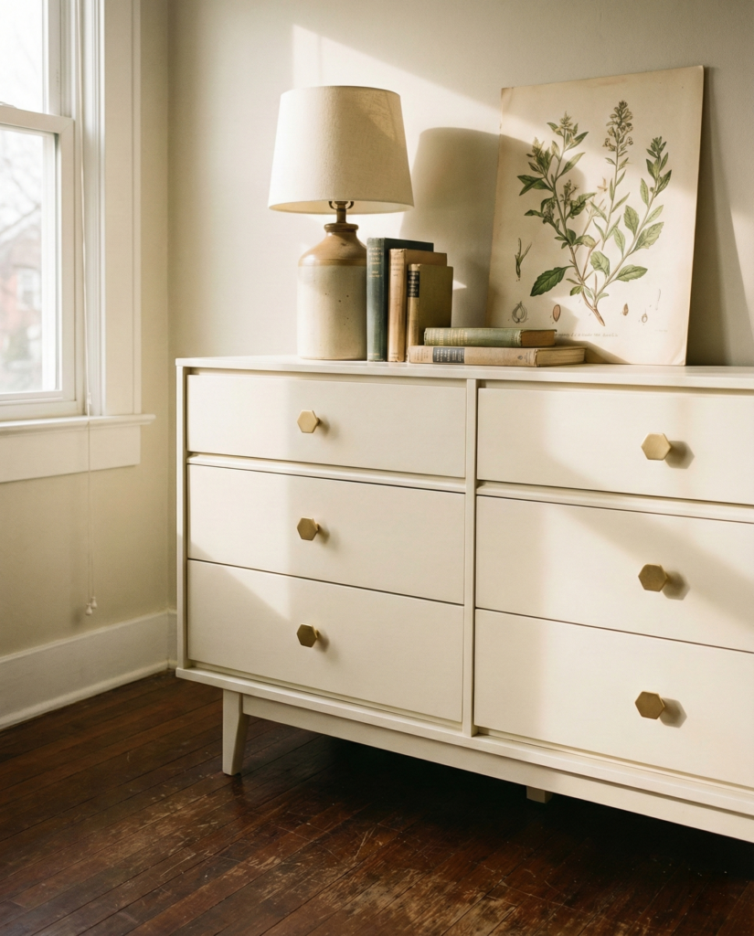 Use the rule of three. A stack of three hardcover books with interesting spines. A plant that isn’t dead yet (a snake plant is hard to kill) in a nice pot. Maybe a cool architectural lamp or a framed print leaning against the wall. Give it room to breathe. It doesn’t have to live in a bedroom. A long, low dresser makes an incredible media console under a TV or a credenza in a dining room.