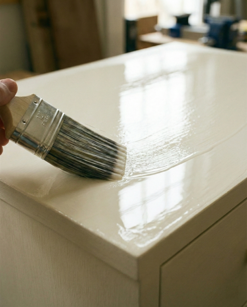 13. Protection. Paint isn’t durable on its own. If you don’t seal it, the first time you set a water glass down, you’ll ruin hours of work. I used a matte water-based polyurethane. Brush on two or three thin coats, letting it dry between. It looks milky when wet but dries clear.