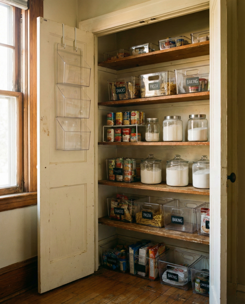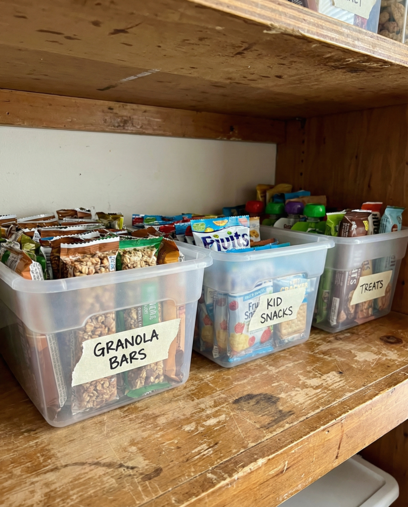 - Clear Plastic Bins: These are your workhorses. Buy them in multiple sizes. You want things to be visible. If you hide the granola bars in an opaque blue bin, they will go to die.