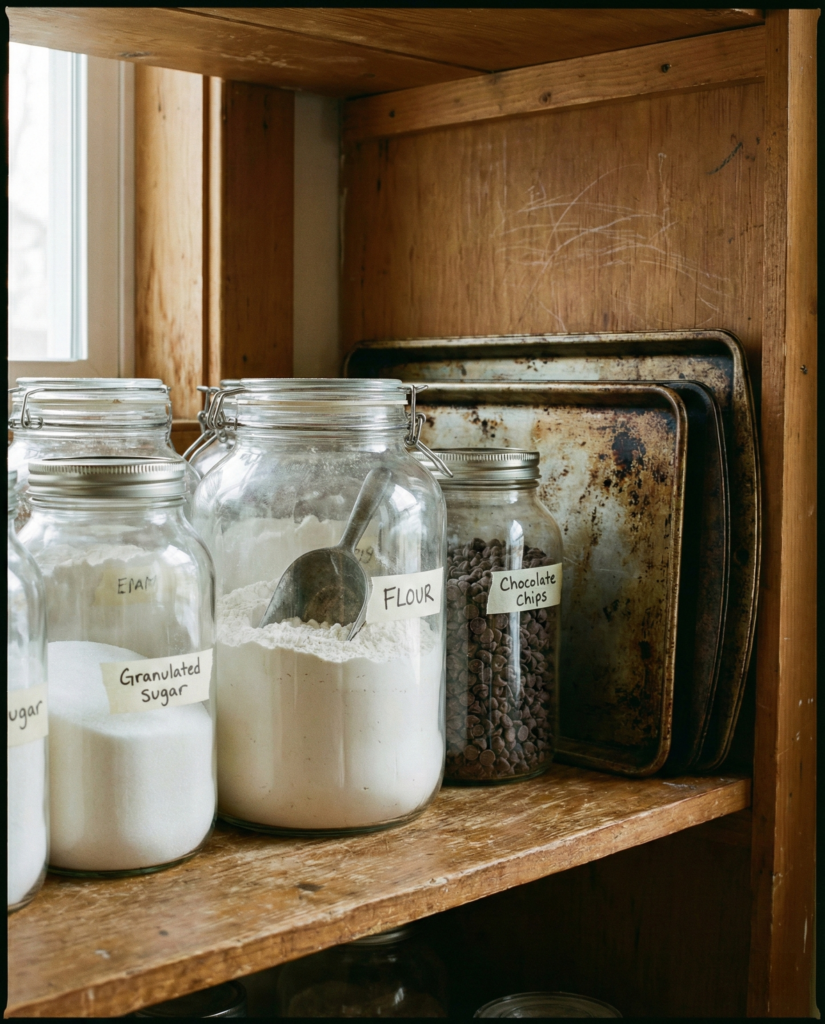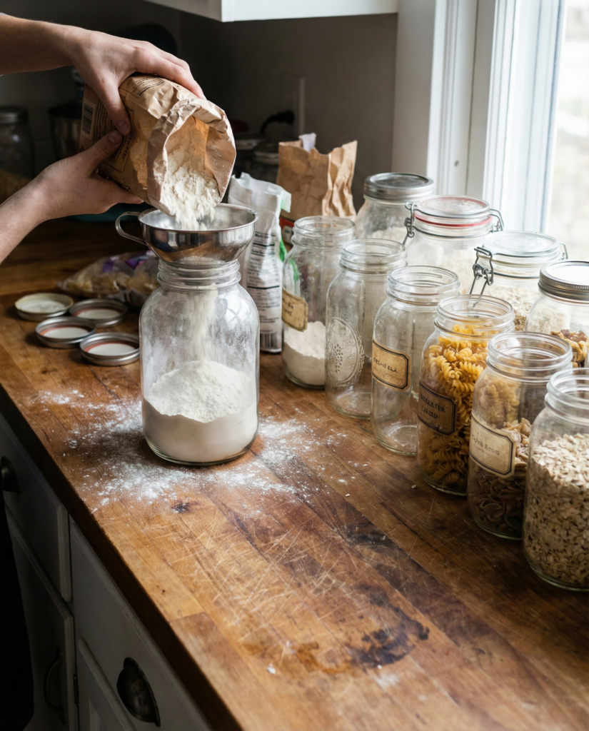 Decanting (pouring things into jars) is a polarizing topic. Here’s the rule: Decant anything that comes in a flimsy bag or a box that doesn’t reseal well. Flour, sugar, rice, and pasta belong in jars. They look better, they stay fresher, and they stack better. Leave the canned goods and individual snack bags alone.